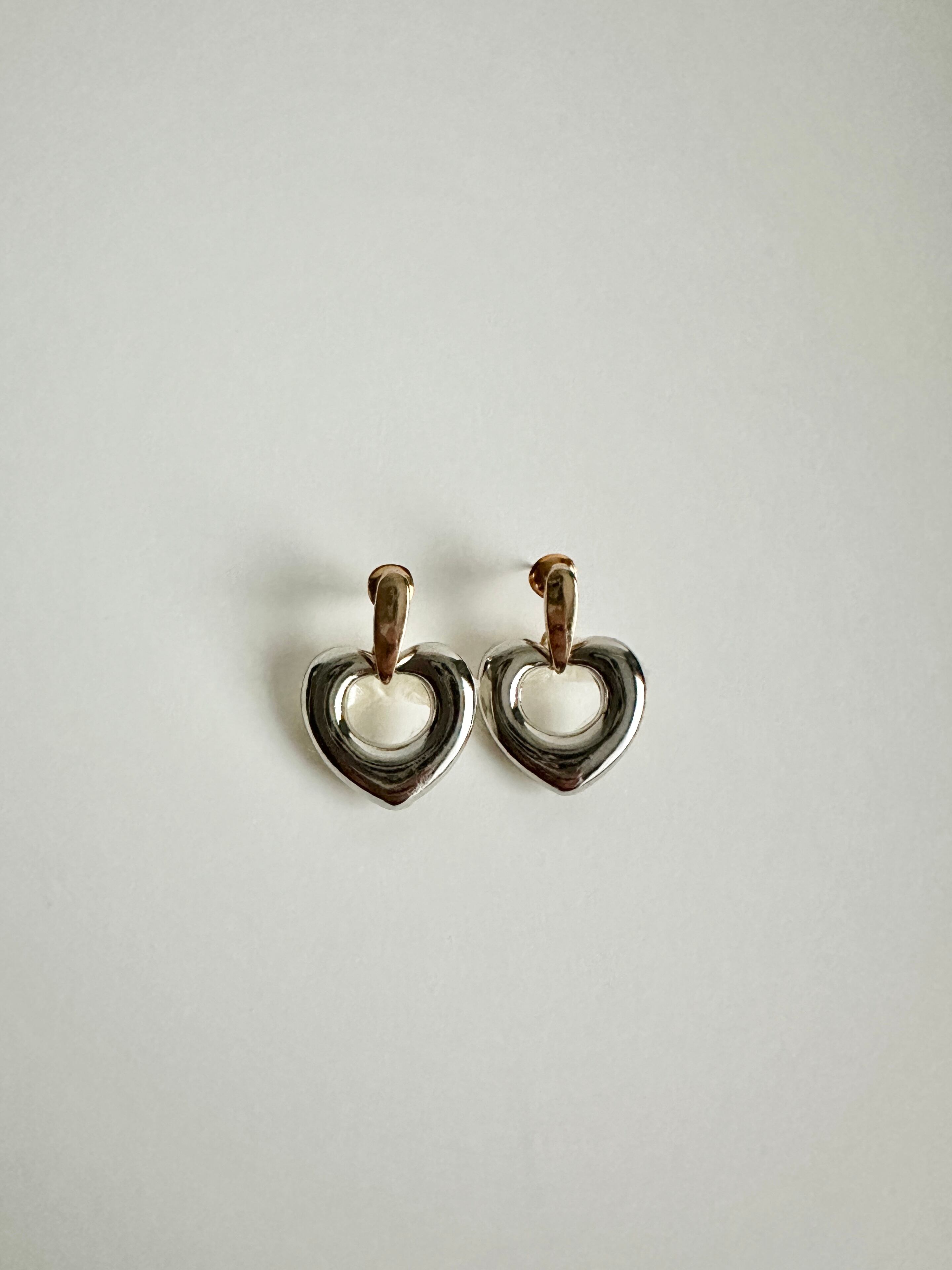 緩やかな曲線を描くハートのフォルム。 揺れるポストの部分はゴールドになっておりピュアでモダンな印象を魅せてくれます。 シルバー&ゴールド 真鍮 縦2.5cm /横 1.2cm
